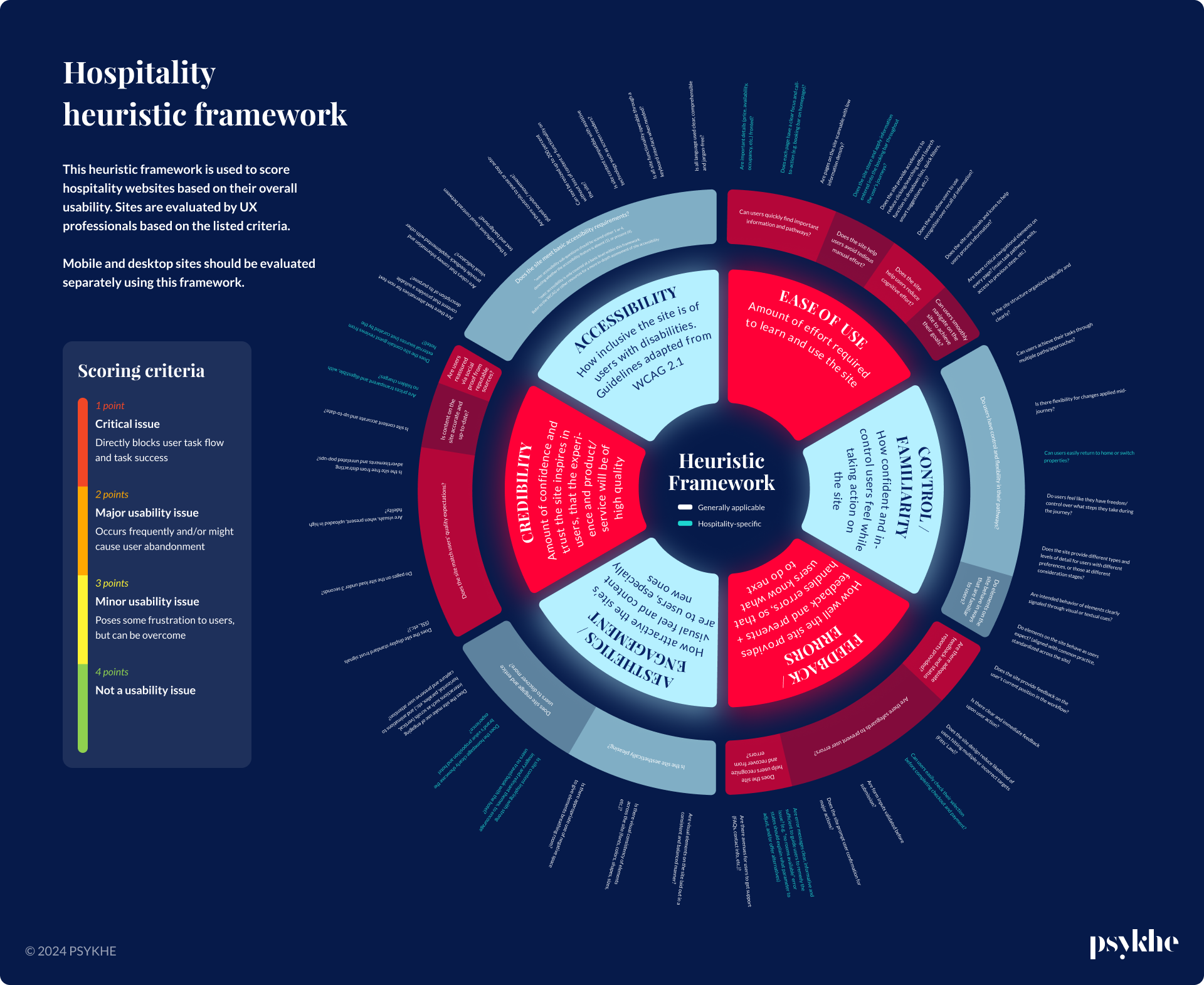 These pillars, alongside their series of sub-questions, form the basis of users’ experiences within hospitality websites and are weighted equally for each website’s final usability score.