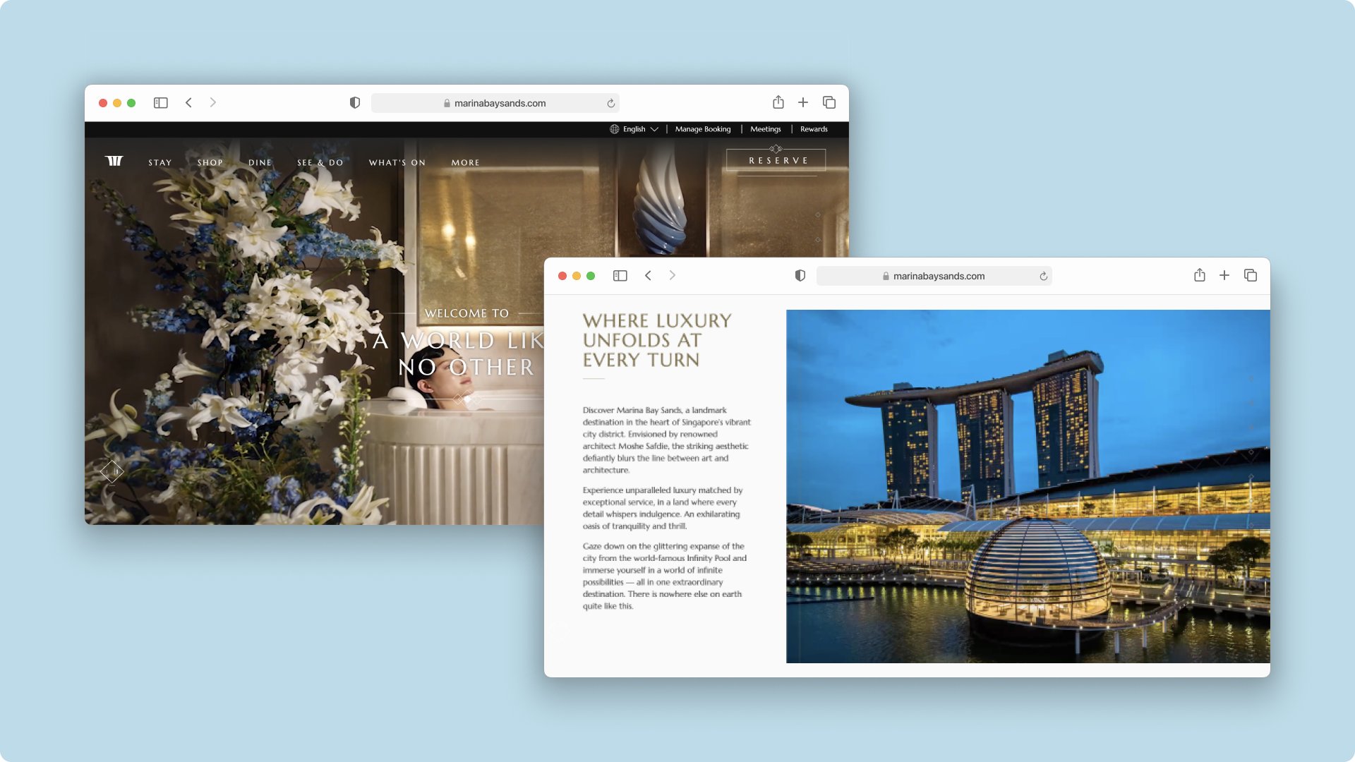 Marina Bay Sands’ website is a powerful regional example of a homepage that makes a statement. Users are intrigued by the “world like no other” tagline and compelled by the grandeur captured in the hero visual; one scroll then brings them to Marina Bay Sands’ promise of unparalleled luxury and exceptionality.