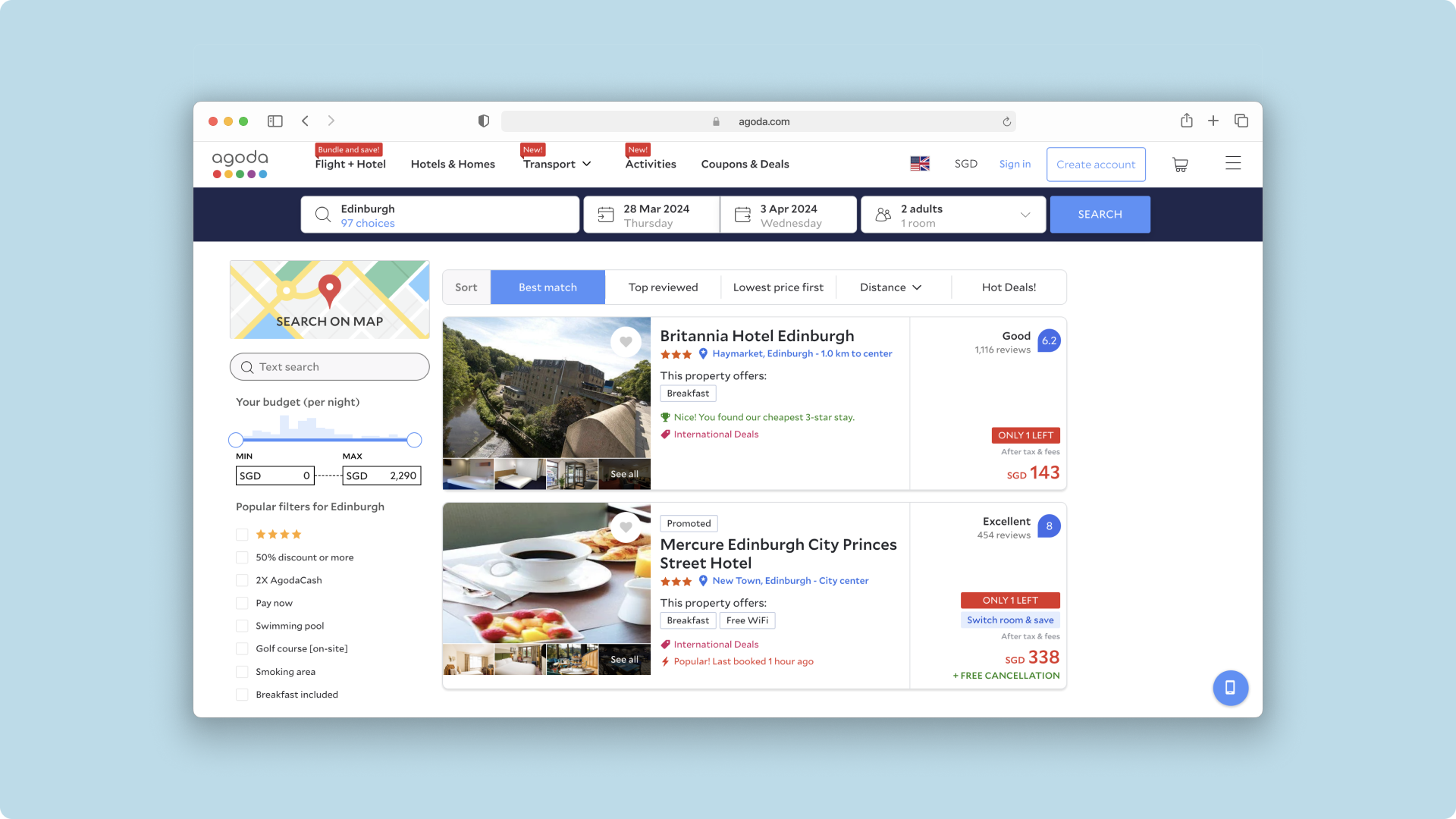 Agoda makes comparing hotel options straightforward by fronting crucial details about each property. Users do not have to click on each property in order to view the location, guest ratings and lowest price, enabling them to make an informed decision early in their journey. Guests can immediately identify properties that are most suited to their needs.