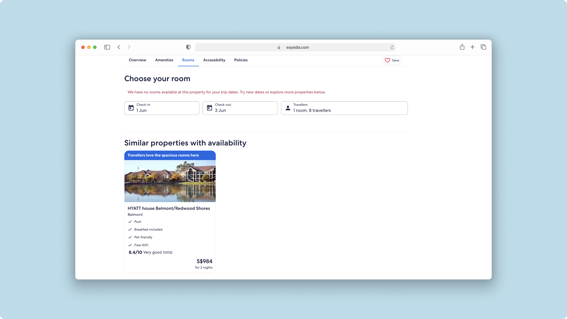 Expedia’s booking engine displays an error statement that provides value to users. On top of indicating that there are “no rooms available” for the user’s search parameters, it provides a concrete suggestion as to what action to take next. The travel giant also suggests similar properties with availability, enabling the user to continue with their browsing journey at a hotel that better meets their needs.
