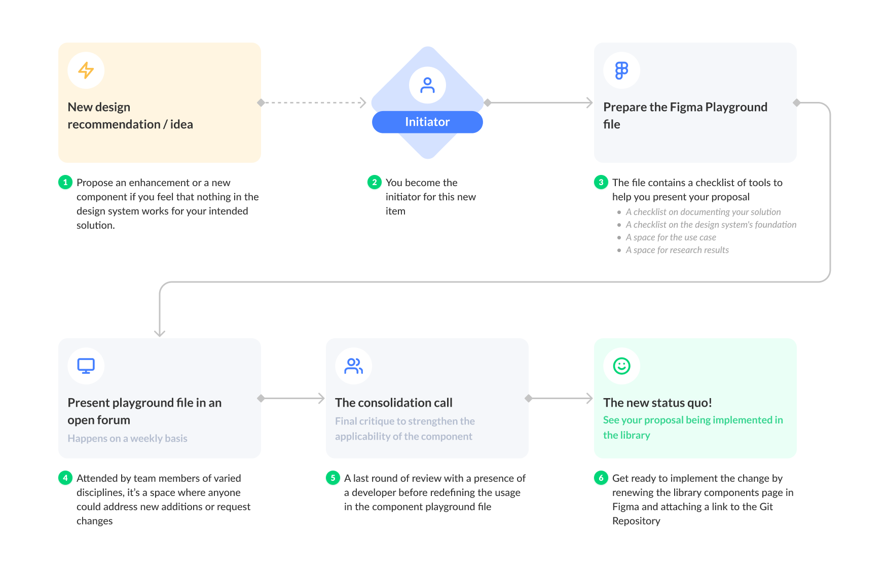 Wart Burggraaf, the founder of govern.design, has created a step-by-step approach when taking on a change suggestion. The goal was to create a straightforward workflow that encourages teams or individuals to initiate change. To this end, Burggraaf suggests a weekly open forum for anyone to illustrate a recommendation (using the figma playground file) to the broader design system team. Anyone can join in the discussion, regardless of their discipline. Once the idea has been refined, together with a developer’s input, it becomes the new status quo.