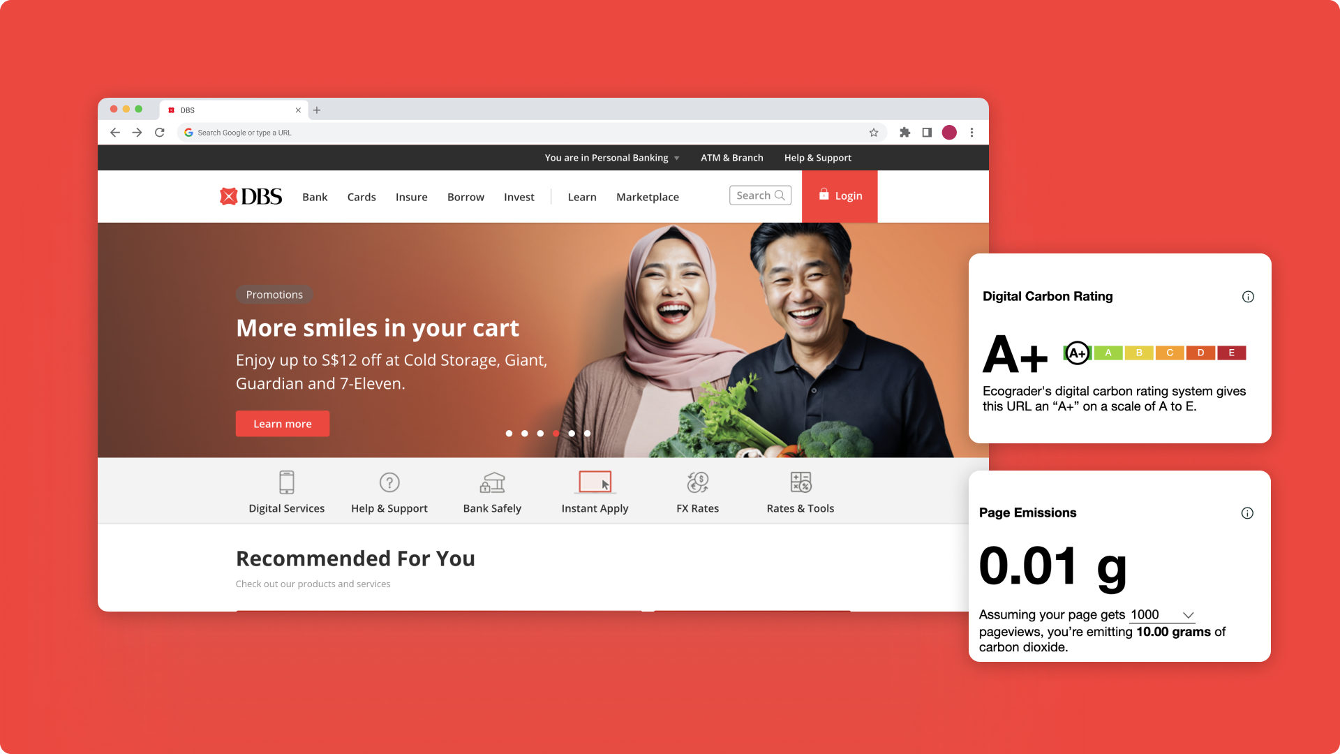 DBS’s website is a prime example that high traffic, rich content and striking visuals don’t have to come at the expense of sustainability. With an impressive A+ rating and an ultra-low carbon footprint of just 0.01g CO₂ per pageload, the site combines vibrant aesthetics with efficiency. Its low-carbon website includes effective above-the-fold design ensures quick loading times and easy access to essential information, demonstrating that a well-designed site can be both comprehensive, and energy efficient.