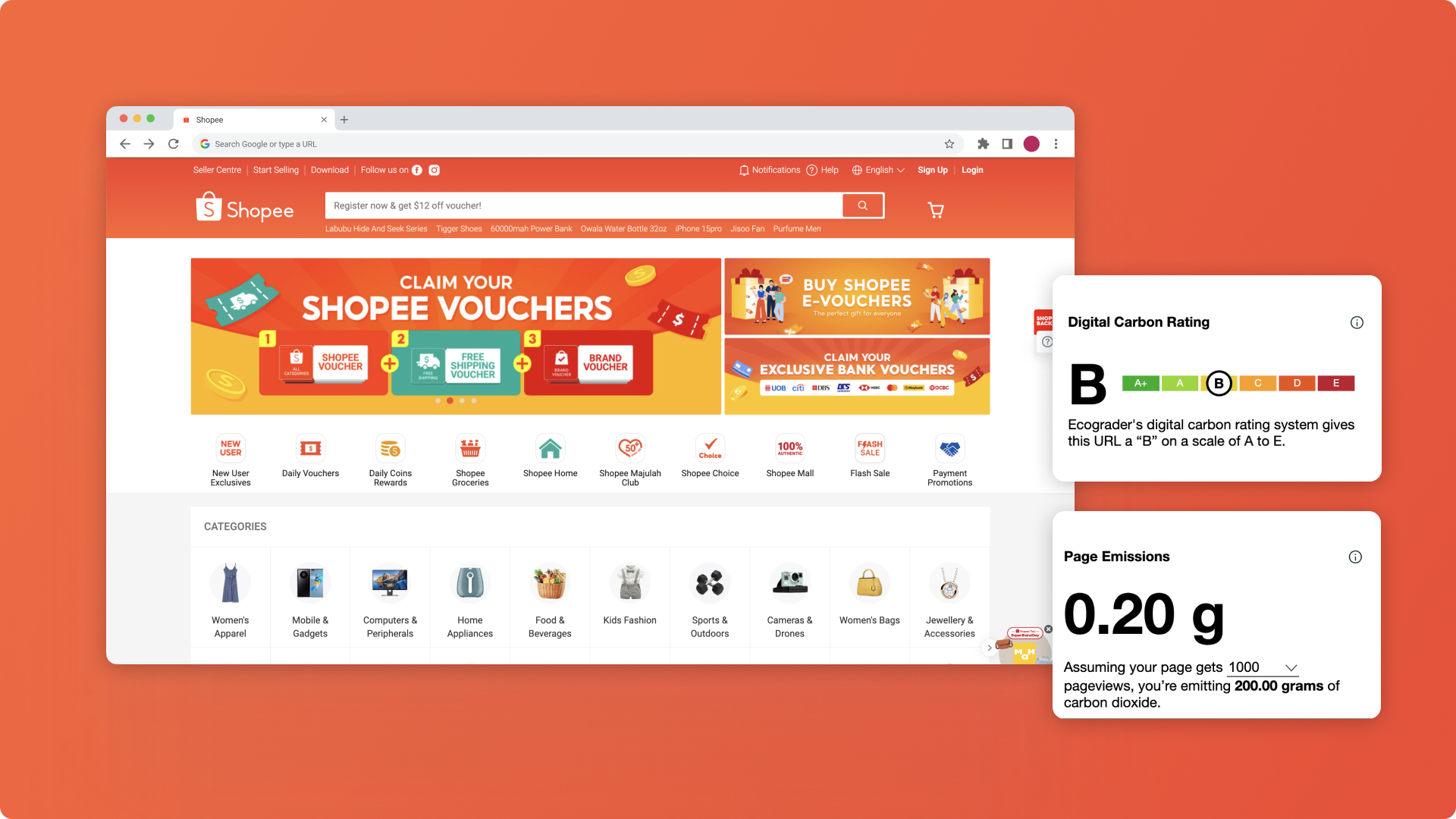 Defying conventional expectations, e-commerce platform Shopee scores a B rating on Ecograder, producing a low carbon footprint of 0.19 g CO₂ per pageload. Despite the multitudes of images that support consumer browsing of products, appropriate image sizing and responsiveness improves load time and reduces required layout shifts. Other powerful factors include SEO-optimised product pages as well as relatively strong accessibility accommodations.