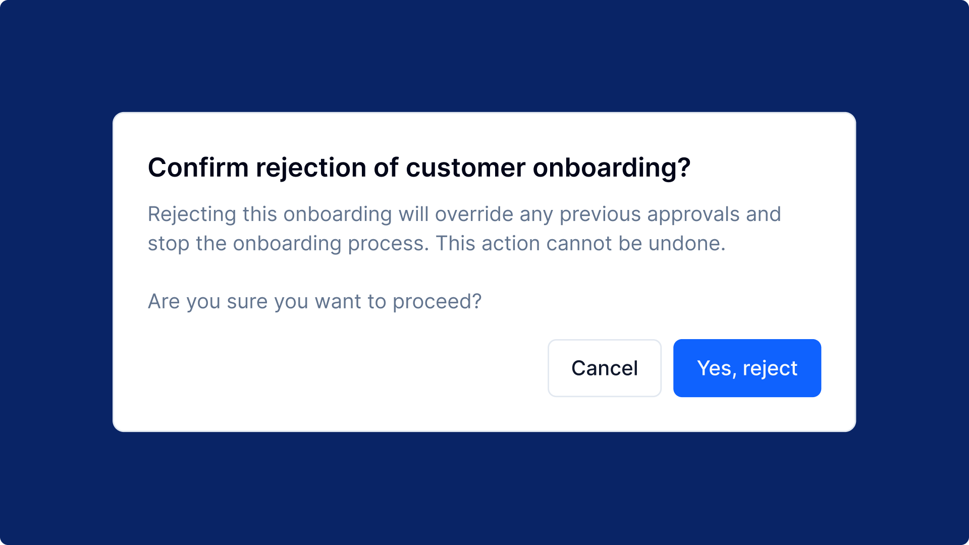 I once worked on a financial onboarding platform involving multiple departments. If one person rejected a customer’s onboarding, that decision overrode everyone else’s input in the chain. Originally, this confirmation was done with a simple toast notification—too quick, too easy to miss. I advocated for a confirmation modal instead, one that would require the reviewer to pause, double-check, and explicitly confirm the rejection. This added moment of friction ensured that such a consequential step wasn’t taken lightly or by mistake. By embedding purposeful friction into the interface, design transforms beyond usability, serving as an essential safeguard in environments where precision and caution are paramount.