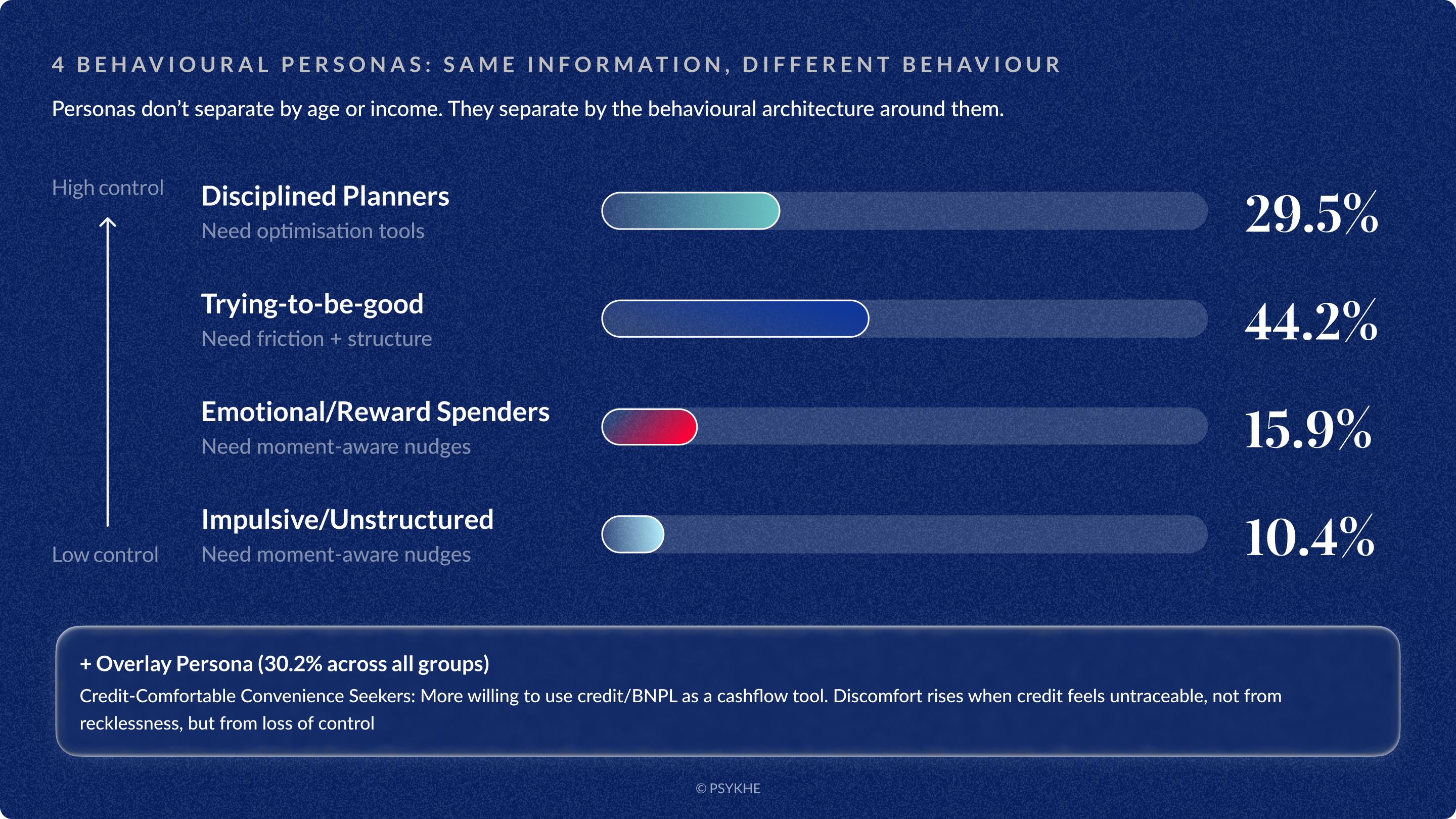 This article draws on primary research conducted by PSYKHE with 353 Singapore Gen Z respondents (ages 16–28), mapped across four behavioural personas. The research examined saving habits, spending triggers, BNPL usage, financial literacy, confidence, and credit comfort.
