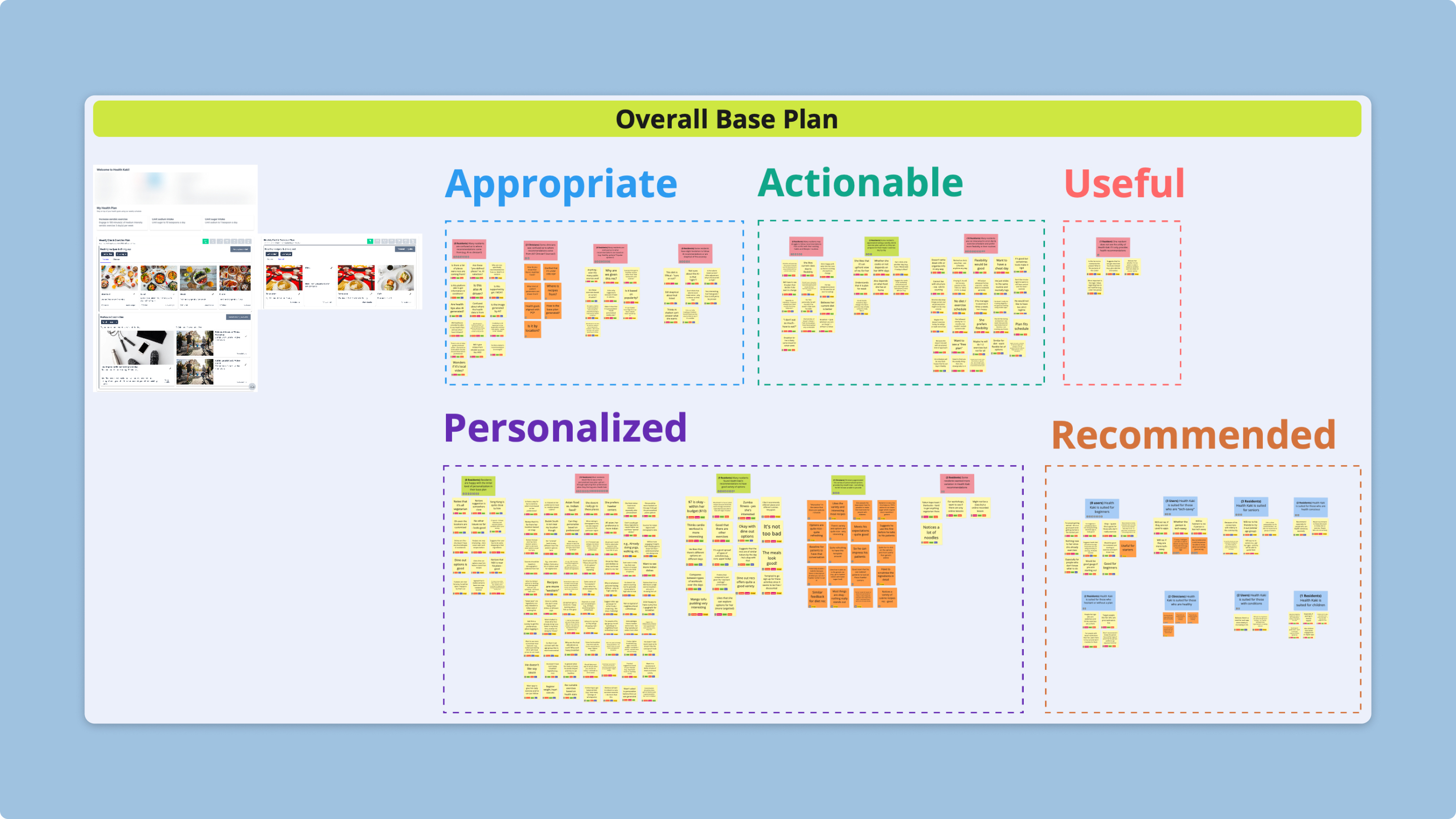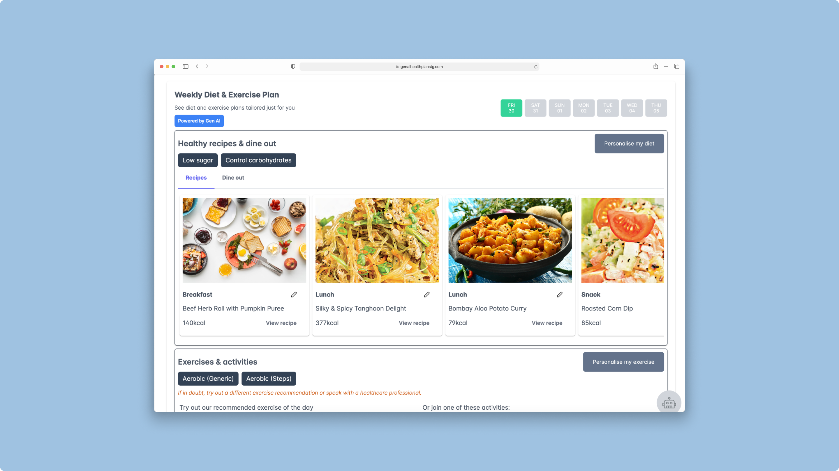 Through collaborative workshops involving multiple technical partners and healthcare agencies, we developed the initial requirements for a resident-facing self-help tool that would provide personalised diet & exercise recommendations on the fly. The proof of concept centered on 3 key defining features: