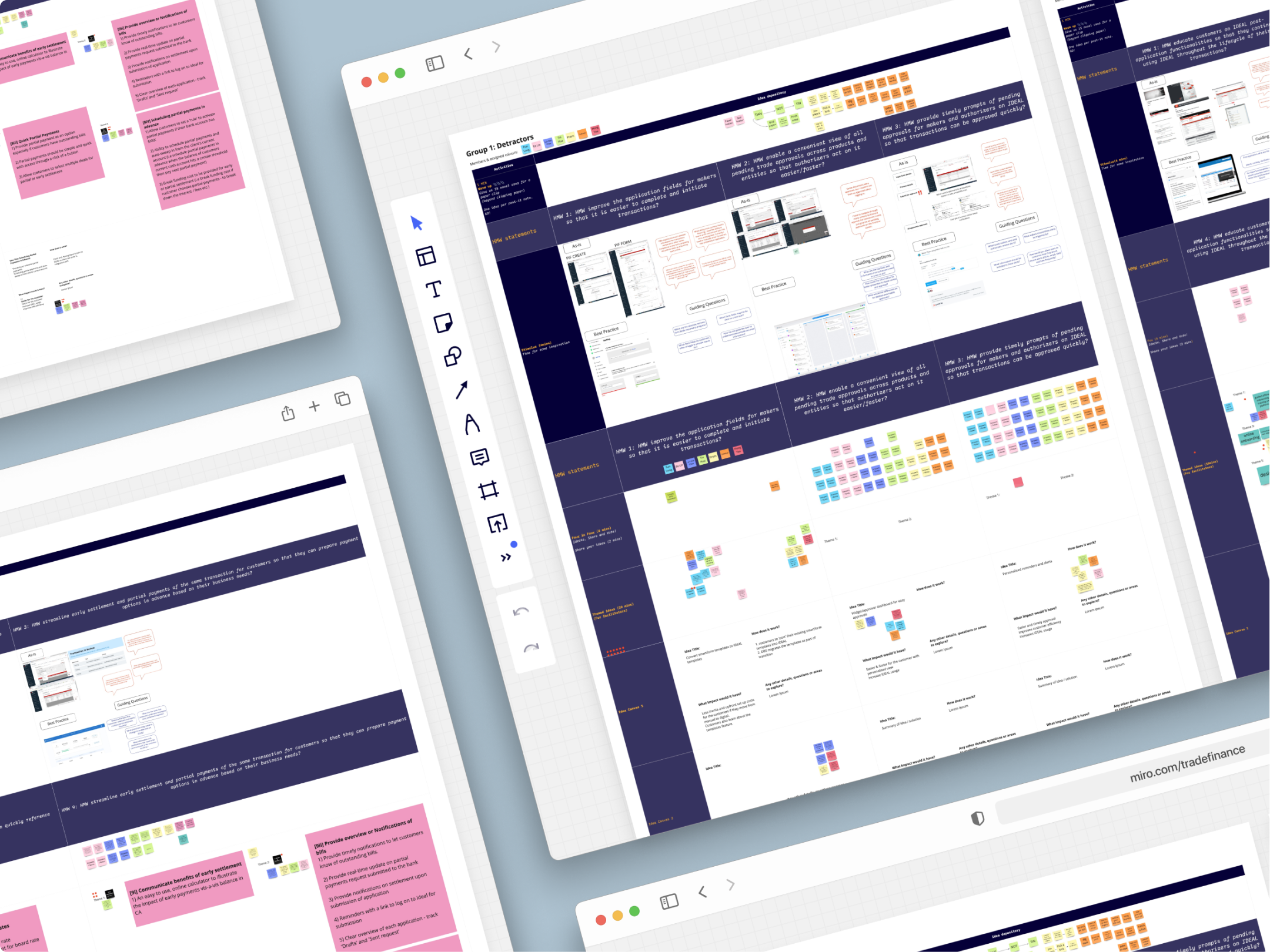 As part of our research synthesis, research notes were consolidated and grouped into tangible problem statements to identify opportunities for trade innovation. We refined these problem statements further into 52 How Might We statements to be used for ideation.